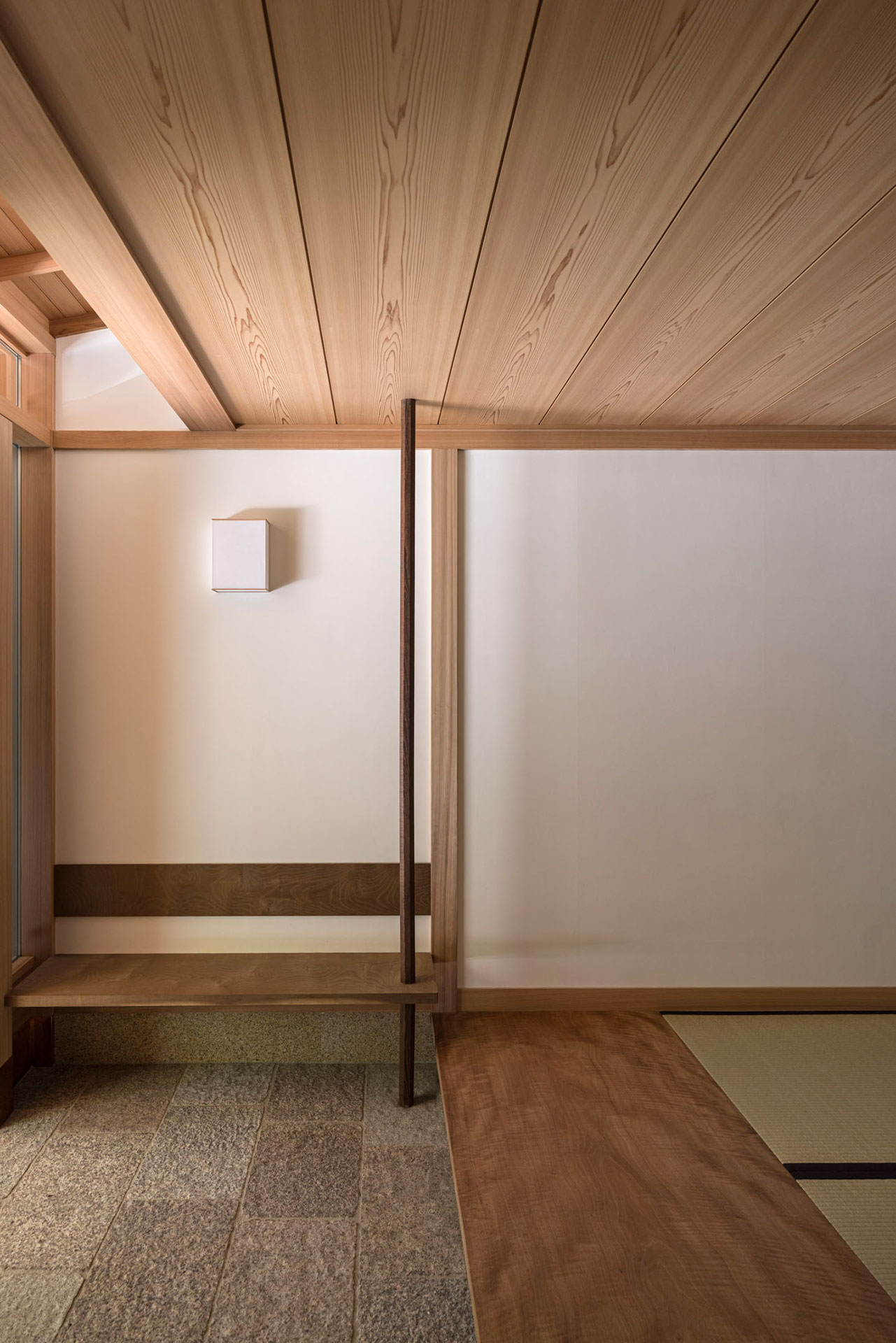 内部の構成としては、中央部にリビングとダイニングを配置し、エントランスからは回廊を歩くかのように畳敷きの廊下を巡らせ、外周部に各居室を設けた。リビングとダイニングは、天井が高く、大ぶりの栗材を柱と梁にして、古民家がもつ力強さを表現したいと考えた。逆に外周部に配置した廊下と居室は、天井高が低く外部に水平に広がっていくような、数寄屋建築になっている。エントランスは広く一枚板のタブザクラを上がり框として、三畳敷きの取次とした。そこから続く畳廊下の先には東側の景色があらわれ、天井の高い中央部に導く。低いところから水平に広がり、天井の高いところへ導く、視線の移ろいと回遊性について考慮された構成になっている。