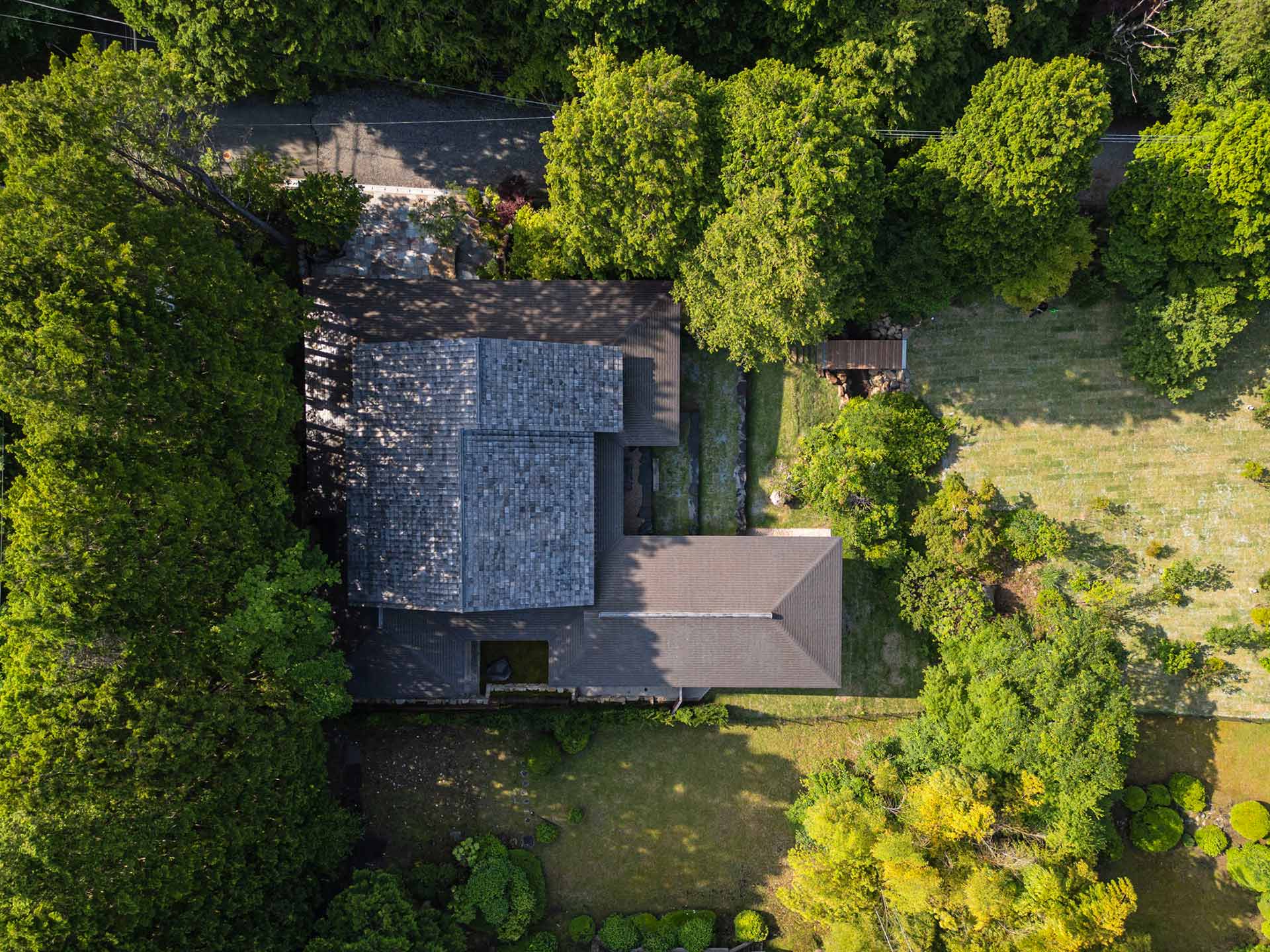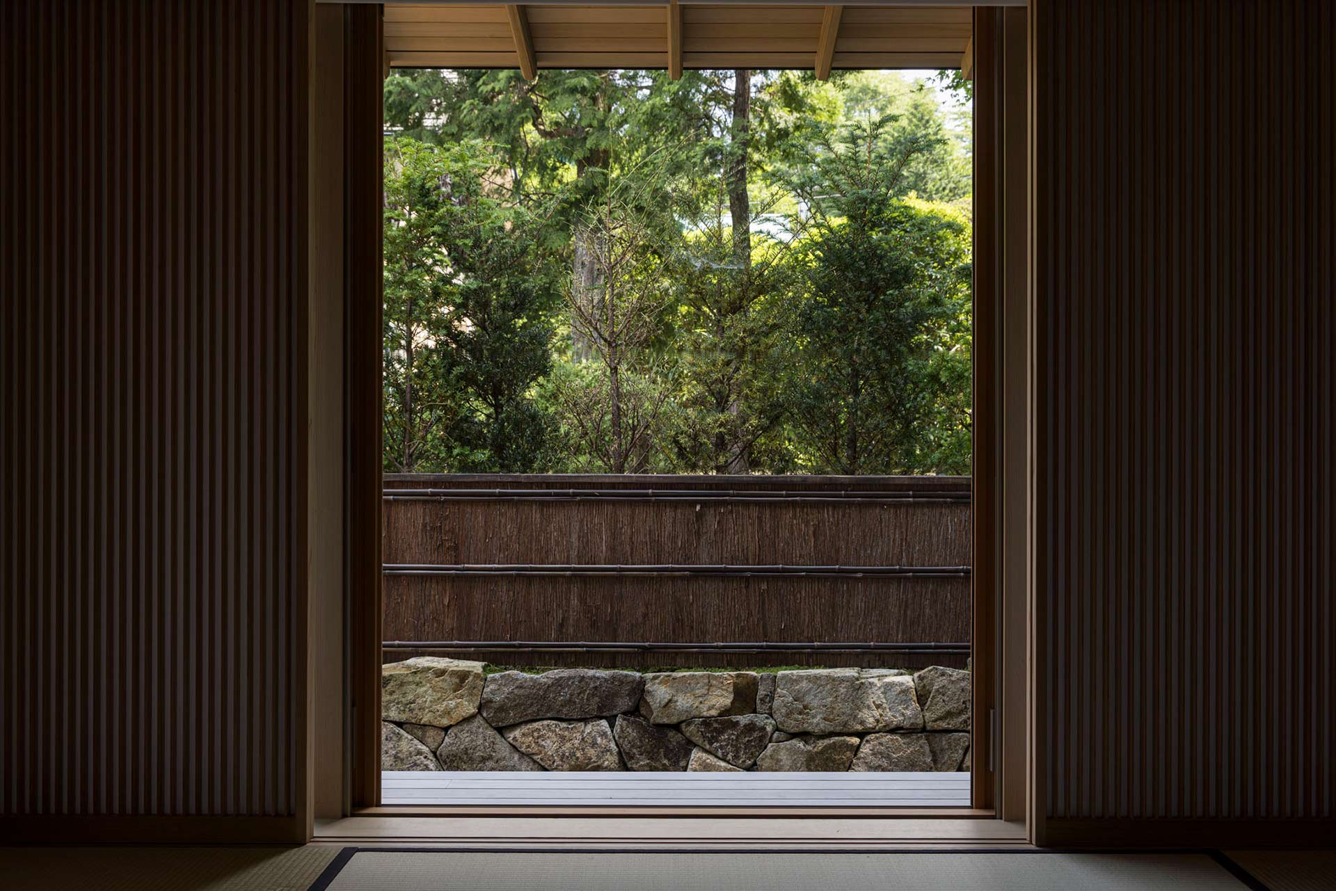 箱根仙石原、約1600平米ほどの敷地に、南北を横断するように小さな枯れ沢があり、東側に向かって緩やかに傾斜がある。深緑に囲まれた敷地では、湿気を考慮して、西側の高台に建築を配棟して、東側の敷地を大きく開けた。高台から見る景色、東側にのぼる朝日や月の見え方も考慮して高さや配置を決めている。建築面積は約260平米、木造平屋。屋根は中央部を瓦屋根として、外周部は銅板葺きで3段熨の棟瓦を配している。