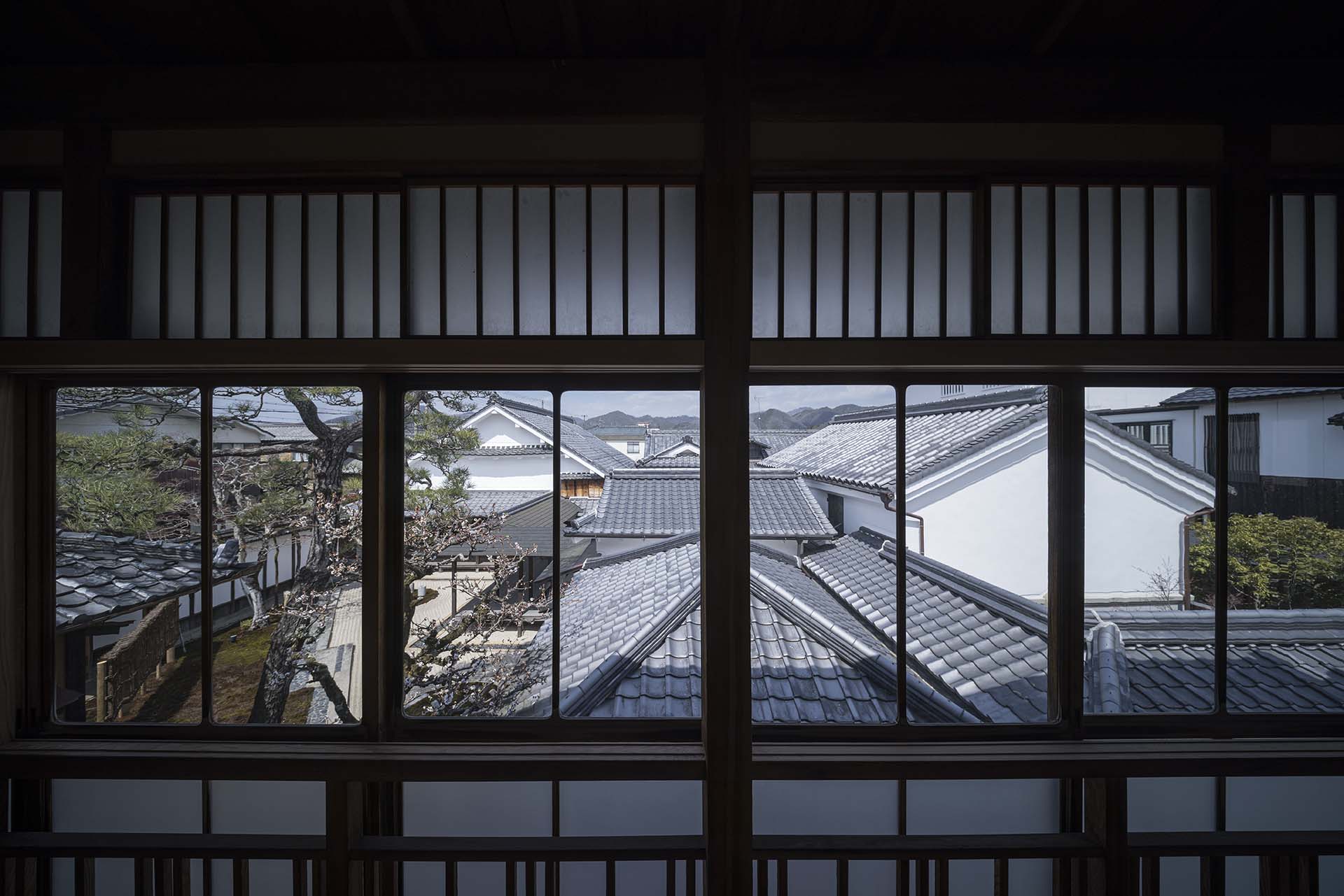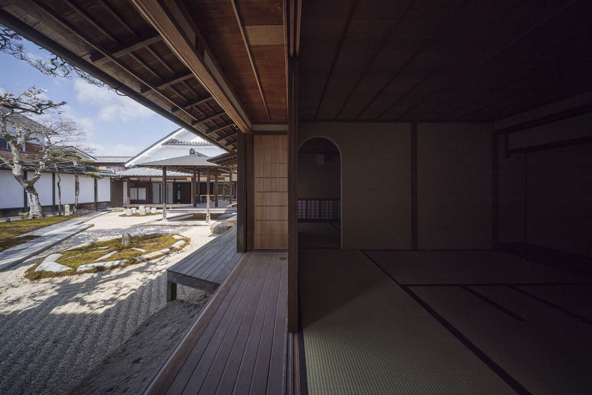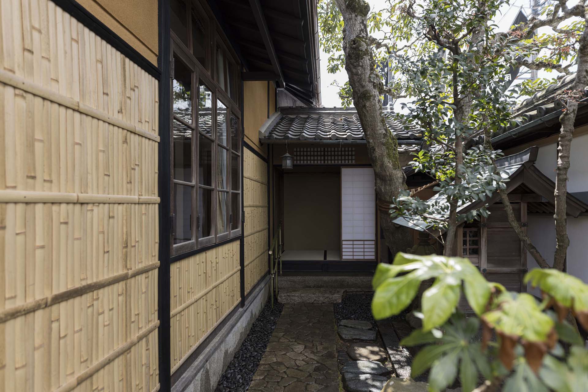 商家の建物としてその優美さを誇った建築群の完成期である大正期に思いを馳せて、建物そのものを文化的資源と考え、商家特有の小屋組や旧来の工法に習い、また空間構成や仕上げにおいて時間を巻き戻してゆくように、「時代を還る建築」として向き合い再構成を成し遂げたのである。豆家の2階から甍の連なりを眺めつつ、往時に心を巡らせ寛いだ時間を過ごしてほしい。