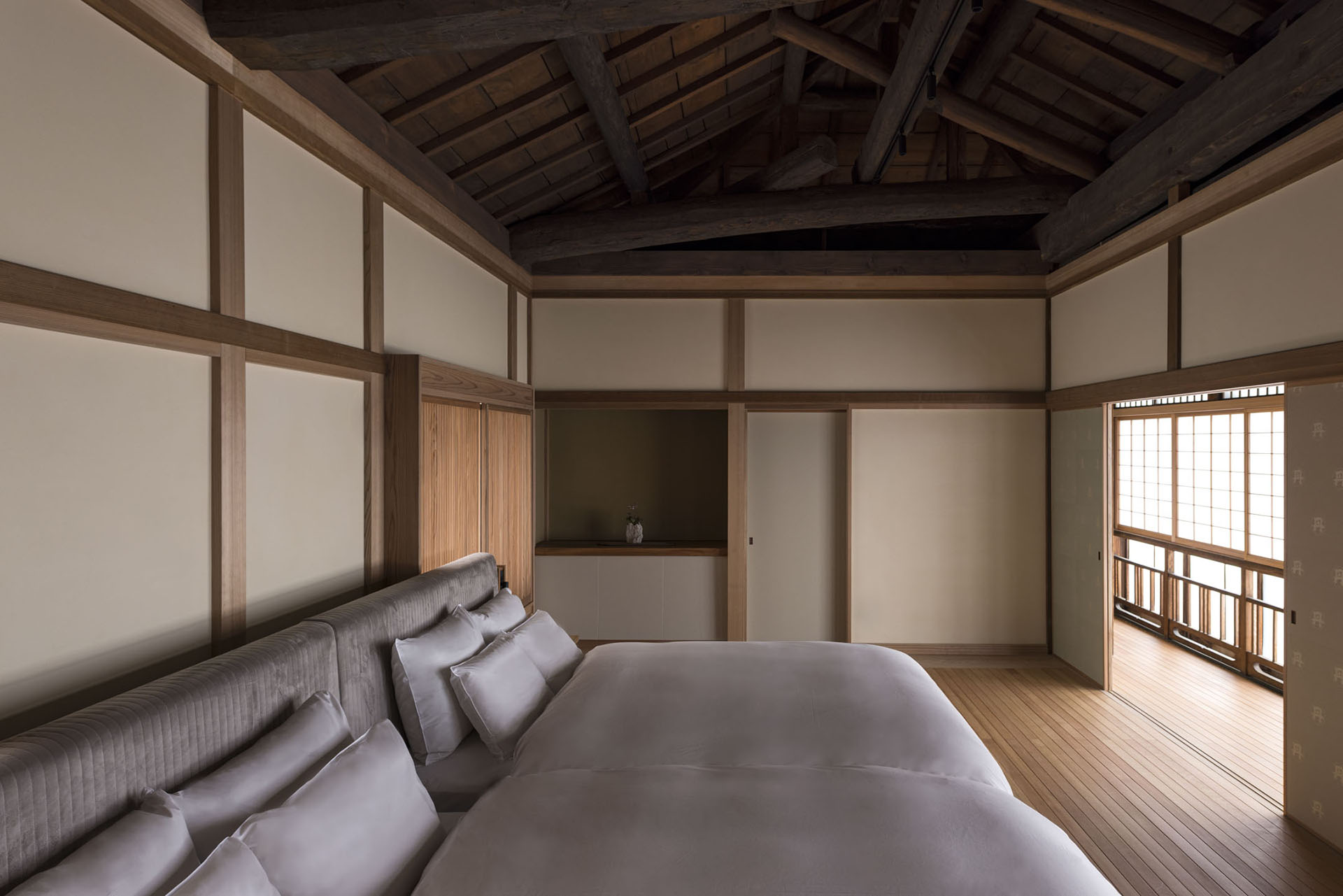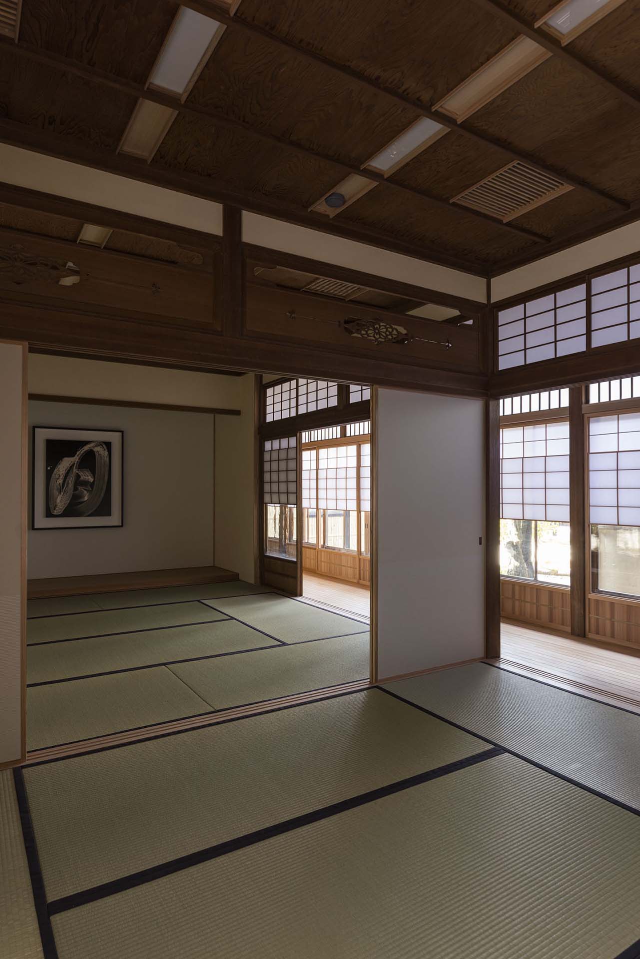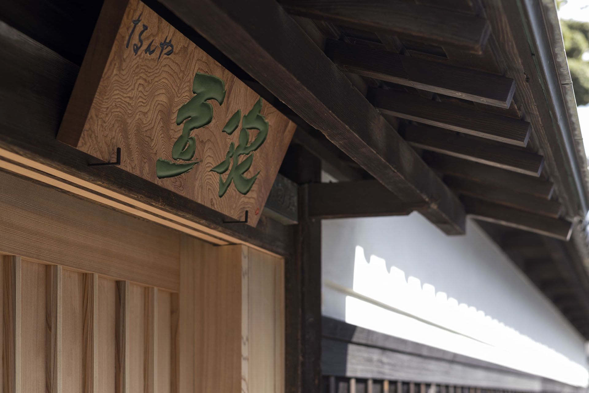 商家の建物としてその優美さを誇った建築群の完成期である大正期に思いを馳せて、建物そのものを文化的資源と考え、商家特有の小屋組や旧来の工法に習い、また空間構成や仕上げにおいて時間を巻き戻してゆくように、「時代を還る建築」として向き合い再構成を成し遂げたのである。豆家の2階から甍の連なりを眺めつつ、往時に心を巡らせ寛いだ時間を過ごしてほしい。